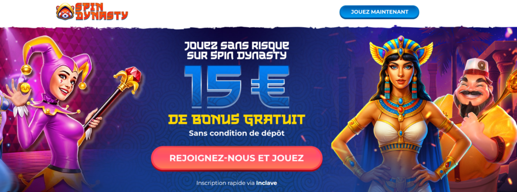 Vous pouvez vous inscrire via notre lien pour recevoir 15€ sans dépôt à utiliser sur le casino Spin Dynasty.