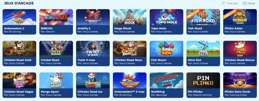 Les amateurs de sensations rapides foncent vers l’onglet arcade. On y déniche le Plinko, des Crash games nerveux et les Mines, très prisés pour leur rapidité d’exécution immédiate.