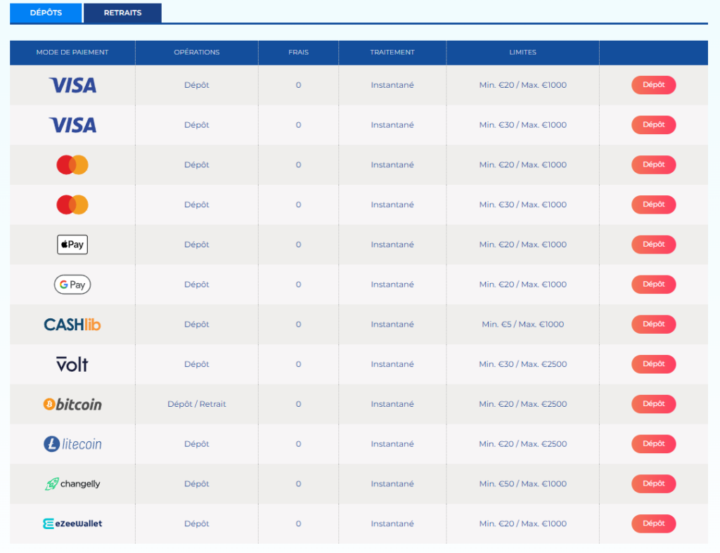 | Méthode | Délai Dépôt | Délai Retrait | Frais |