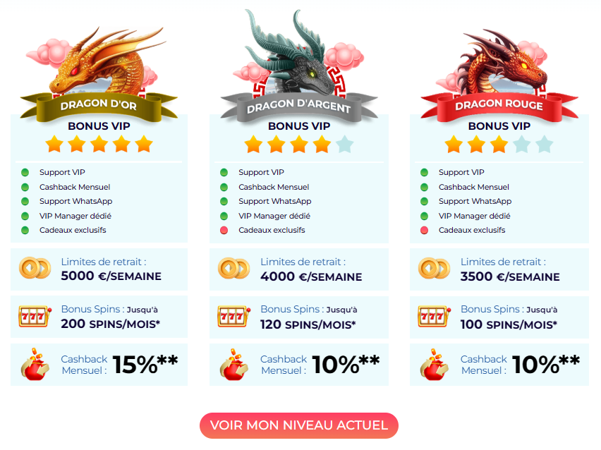 Ce programme VIP exclusif récompense votre régularité en vous faisant progresser à travers différents paliers, du Dragon Vert au prestigieux Dragon d’Or. En grimpant dans la hiérarchie, vous débloquez des avantages sur mesure tels qu’un cashback mensuel atteignant 15 %, des cadeaux personnalisés et un accès direct à un conseiller dédié pour optimiser chacune de vos sessions.