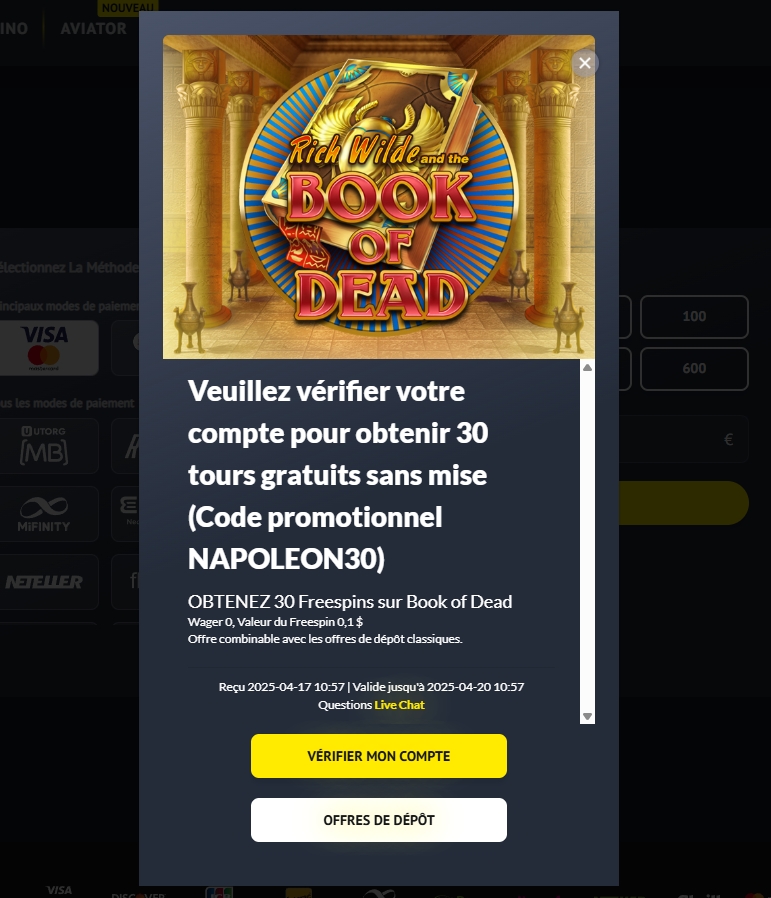 Bonus sans depot : Code Napoleon30 pour recevoir 30 tours sans dépôt sur yonibet à l’inscription.